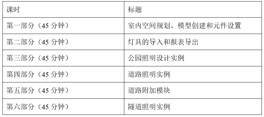 本課程的目的在于通過(guò)一些室內(nèi)照明、室外照明、道路照明和隧道照明實(shí)例使用戶能更熟練的使用軟件進(jìn)行照明設(shè)計(jì)。