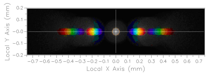 波片為通過的光的每個偏振分量提供一個差分相移。這種相移的波長依賴性意味著光束的每個顏色分量都會得到一個稍微不同的偏振調(diào)整。垂直偏振片再次濾除光的所有水平偏振分量。對于波片,偏振片以外的輻照度顯示出消光交叉圖案的減少。關(guān)于光分布的一個更有趣的觀點(diǎn)是它的彩色圖像,它顯示了一種彩虹色的分布。