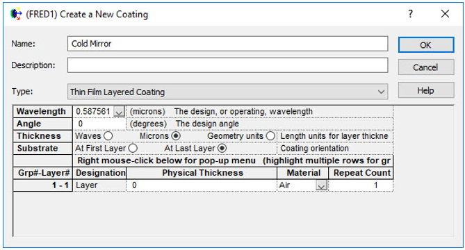 FRED中可以指定幾種膜層類型,例如采樣膜層,薄膜膜系,四分之一波長單層膜層,一般采樣膜層(入射角,波長和偏振相關(guān)),偏振片/波片膜層(瓊斯矩陣) 和腳本膜層。 在此案例中,使用Thin Film Layered Coating類型(圖1)創(chuàng)建冷鏡。