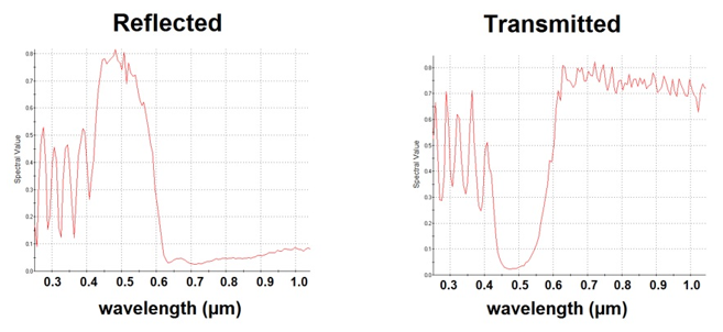 圖3.冷光鏡反射和透射光的光譜分析。請注意,由于膜層是0度入射,0.55um為中心波長,所以在這個較大的入射角處反射較短的中心波長。
