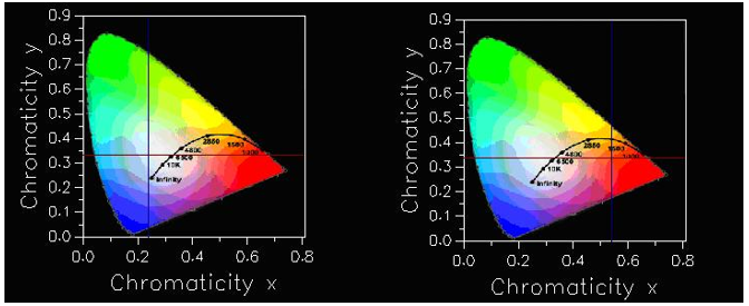 圖5.圖中十字線表示的光束反射(左)和透射(右)分量的平均色度坐標(biāo)。通過將分析面減少到一個像素并評估其彩色圖像來確定該值。