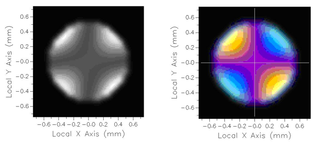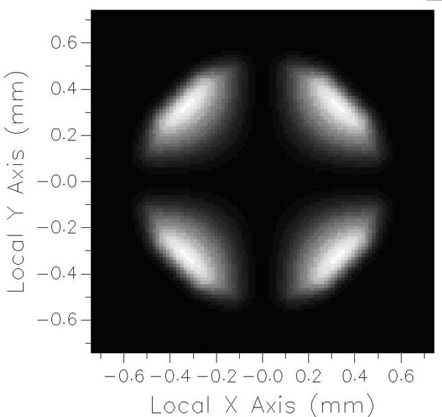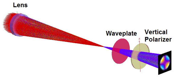 在該系統(tǒng)中,相干的水平偏振白光由透鏡聚焦。波片放置在焦點(diǎn)之外,然后是垂直線偏振片(圖6)。準(zhǔn)直的水平偏振光不通過偏振片,然而,水平偏振光線的擴(kuò)展光束在每個角落處具有一些通過的垂直偏振分量。圖7顯示了沒有波片系統(tǒng)的輻照度。