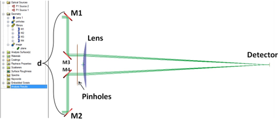 系統(tǒng)的幾何結(jié)構(gòu)如圖1所示。干涉儀由四個(gè)反射鏡、一對小孔、一個(gè)正透鏡和一個(gè)探測儀組成。