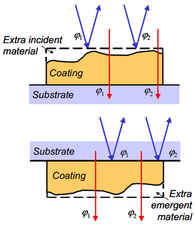 為了計(jì)算由于不均勻性造成的波前誤差,我們必須同時(shí)考慮膜層表面偏離理想狀態(tài)的運(yùn)動以及反射或透射時(shí)相移的任何變化。避免混淆的最簡單方法是在外表面引入一層中等厚度的材料,使外表面完全均勻(圖1)。然后,我們簡單地計(jì)算出反射和透射的相移。在我們的正常約定中,負(fù)相移被轉(zhuǎn)換成波前延遲,通常被視為負(fù)。為了將相位轉(zhuǎn)換成波前誤差,我們將其除以360°。