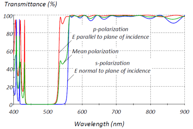 我們用偏振來描述光波電場(chǎng)的方向。雖然是很復(fù)雜,但它的影響是完全明確和可計(jì)算的。圖1顯示了一個(gè)簡(jiǎn)單的長(zhǎng)波通濾波器在斜入射時(shí)的計(jì)算性能,其曲線標(biāo)記為p-偏振、s-偏振和平均極化。這些名稱是什么意思?