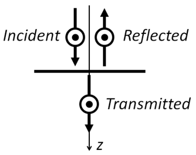 在垂直入射時(shí),對(duì)線性偏振方向影響,因此我們將入射波中的電場(chǎng)的正方向設(shè)置為沿著正y軸。相同的慣例適用于反射波和透射波。對(duì)于相位參考點(diǎn),我們選擇入射波和反射波的坐標(biāo)原點(diǎn),但是z軸從發(fā)射波的后表面或出射表面出現(xiàn)的點(diǎn),我們選擇時(shí)間變量,使入射波的相位在參考點(diǎn)處為零。然后,反射和透射波的相位也就是反射和透射的相位變化。圖2顯示了這種約定。
