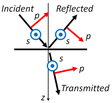 我們約定中的不連續(xù)性會(huì)造成很大的困難,因此我們確保斜入射約定與正常入射約定兼容。我們需要一個(gè)s和p偏振的約定,因此選擇電場(chǎng)的正方向,如圖3所示。很明顯,這一慣例在正常情況下崩潰,如圖2所示。