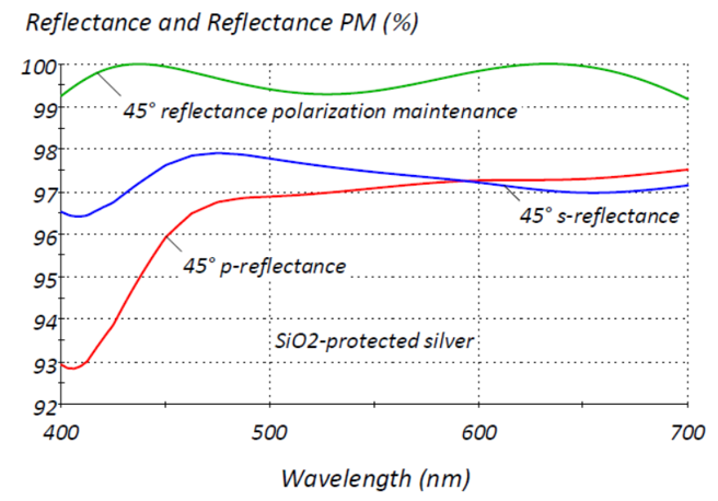 圖4. 115nm SiO2保護(hù)膜銀反射鏡在45°入射時(shí)的反射和反射PM。