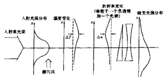 激光在大氣中傳輸時部分能量被空氣中的分子和氣溶膠吸收。被吸收的熱量將空氣加熱,導(dǎo)致氣壓上升,空氣膨脹,空氣密度降低,折射率下降,形成一個負(fù)透鏡,使激光束發(fā)散。當(dāng)存在側(cè)向風(fēng)時,下風(fēng)區(qū)空氣密度降低,因而下風(fēng)區(qū)的折射率減小,形成特有的彎向上風(fēng)區(qū)的光束分布,使光束畸變、彎曲和發(fā)散,劣化光束質(zhì)量。這就是熱暈效應(yīng)。它是激光在大氣中傳輸時所面臨的嚴(yán)重問題之一。
