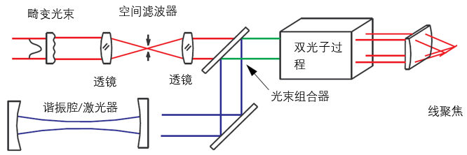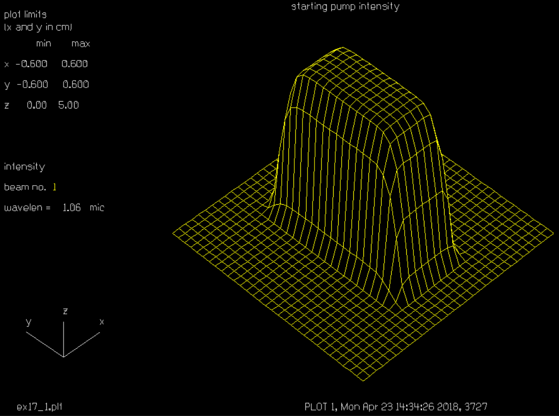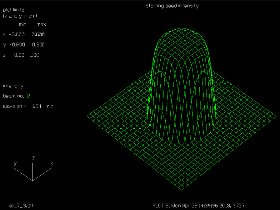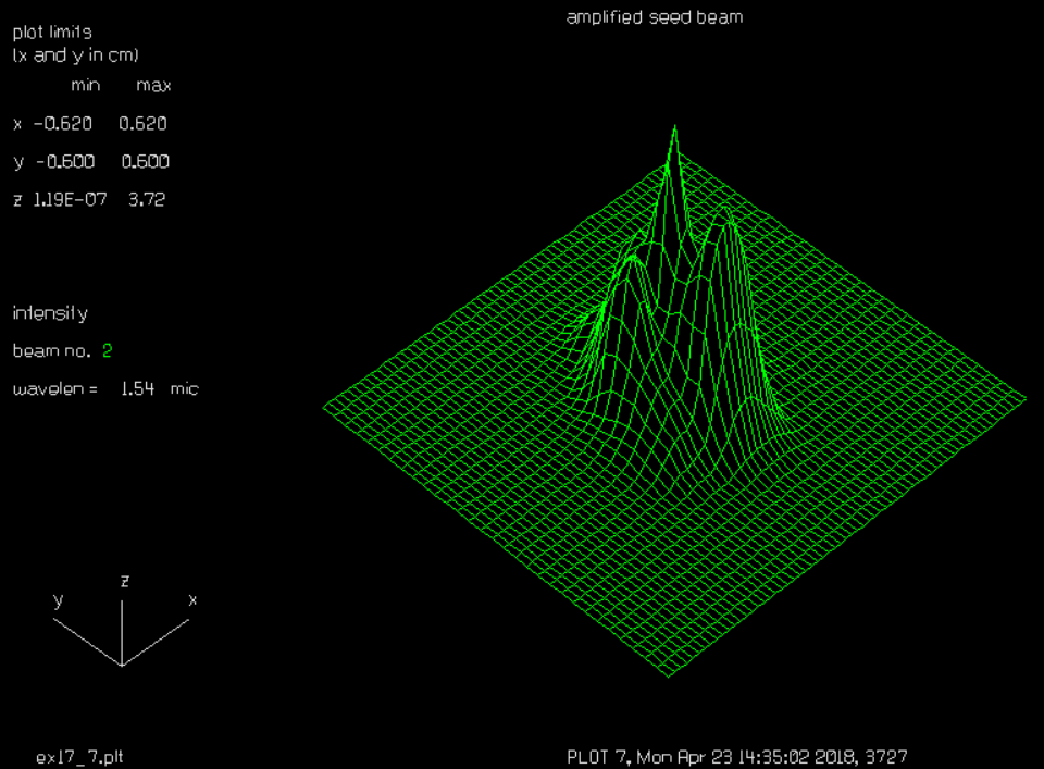 本例說明了通過一束更短的泵浦光對種子光進(jìn)行拉曼放大的過程。泵浦光波長為1.06u,種子光的波長是1.54u。泵浦光和種子光都有畸變,種子光穿過一個空間濾波器,去除其他光束的干擾。種子光和泵浦光結(jié)合后穿過一個拉曼增益器,放大器衰減泵浦光同時將種子光放大。在這個模型中,泵浦光的任何相位都沒有附加到種子光上。泵浦光和種子光的光強分布反映了光闌邊緣的衍射效應(yīng)以及光束中的偏差。增益后的種子光輸出經(jīng)過圓柱透鏡聚焦成為一條線光源,可以用于非旋轉(zhuǎn)對稱的光學(xué)元件和矩形陣列。值得注意的是,軟件中的編碼自動選擇了矩陣單位的大小從而在兩個方向上都能得到很好的分辨率。