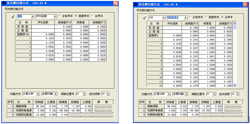 由于雙光楔三維立體深度掃描系統(tǒng)設(shè)計(jì)時(shí)變量因素較多,而且各自影響又比較獨(dú)立,因此采用手工調(diào)節(jié)的方法比較直觀有效,設(shè)計(jì)時(shí)只要在如圖8填寫(xiě)完有關(guān)參數(shù)之后點(diǎn)擊“確定”按鈕即可出現(xiàn)一幅新的設(shè)計(jì)畫(huà)面如圖9。利用每行數(shù)據(jù)右側(cè)滾動(dòng)條即可隨意修改相應(yīng)參數(shù)幷在上方圖形中及時(shí)動(dòng)態(tài)觀察掃描光線(xiàn)變化情況以確定滿(mǎn)足要求的設(shè)計(jì)參數(shù)值。為觀察設(shè)計(jì)效果,可以利用圖10下方所示 “掃描方式”下拉式菜單觀察設(shè)計(jì)中的各種信息,其中擴(kuò)掃描光線(xiàn)的各種掃描效果、掃描輪廓圖形、圖形誤差以及掃描輪廓誤差及公差分析等,如圖9、圖10、圖11及圖12所示。