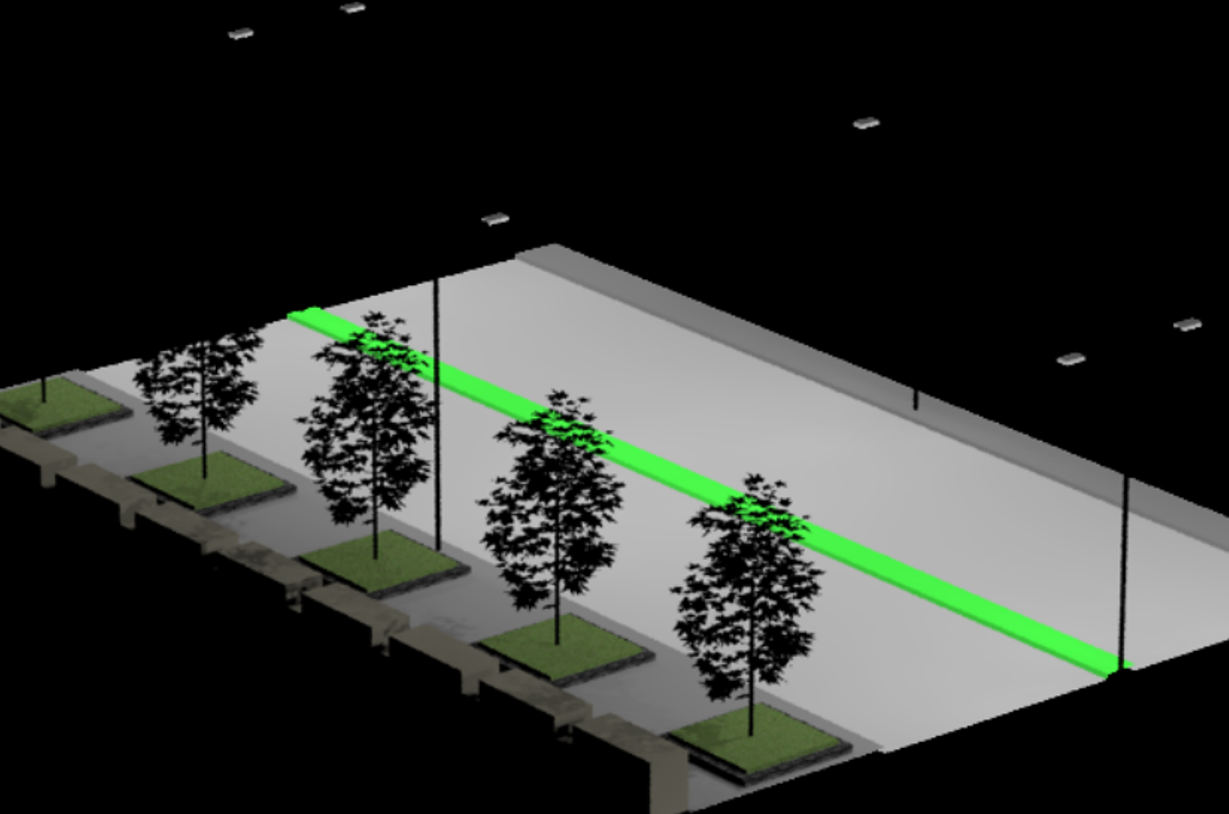 設(shè)計(jì)道路面積合理,其中布置燈具,交通工具擺放合理,符合照明標(biāo)準(zhǔn)。