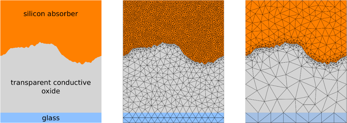 薄膜硅太陽能電池依靠散射結(jié)構(gòu)將入射光衍射到更大的角度,從而在高折射率吸收材料中通過全內(nèi)反射捕獲光。它們的優(yōu)化是當(dāng)前研究的一個(gè)課題。一般來說,即使散射結(jié)構(gòu)在本質(zhì)上是統(tǒng)計(jì)性質(zhì)的,也可以在JCMsuite軟件中通過應(yīng)用周期邊界條件對單元進(jìn)行建模,也可以對簡單、隨機(jī)紋理薄膜太陽能電池進(jìn)行幾何定義和網(wǎng)格劃分,進(jìn)而對不同層材料的衍射、吸收效率進(jìn)行分析。
