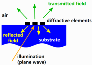 通常,DOE駐留在介質(zhì)襯底上。照明光場(如平面波)從下方或上方照射到DOE。這激發(fā)了透射場和反射場,這是我們感興趣的典型參量。