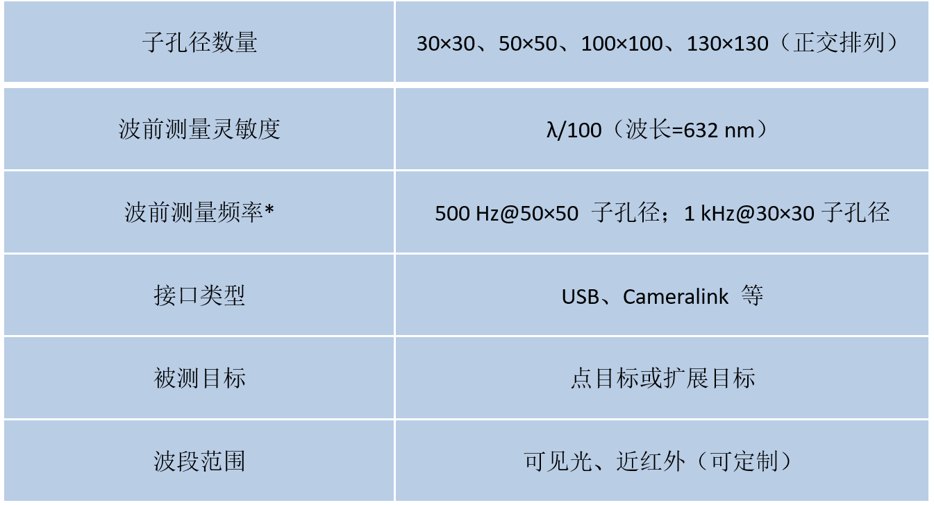 *注:波前測(cè)量過程不僅包括波前圖像獲取,而且包括波前重構(gòu)過程,因此波前測(cè)量頻 率表示的是實(shí)際可獲得波前測(cè)量結(jié)果的頻率。