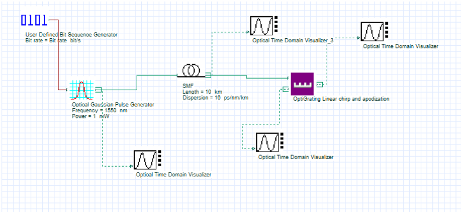 本次案例的目的是利用根據(jù)上述公式產(chǎn)生線性啁啾的光纖光柵,在OptiSystem中實(shí)現(xiàn)色散補(bǔ)償。
