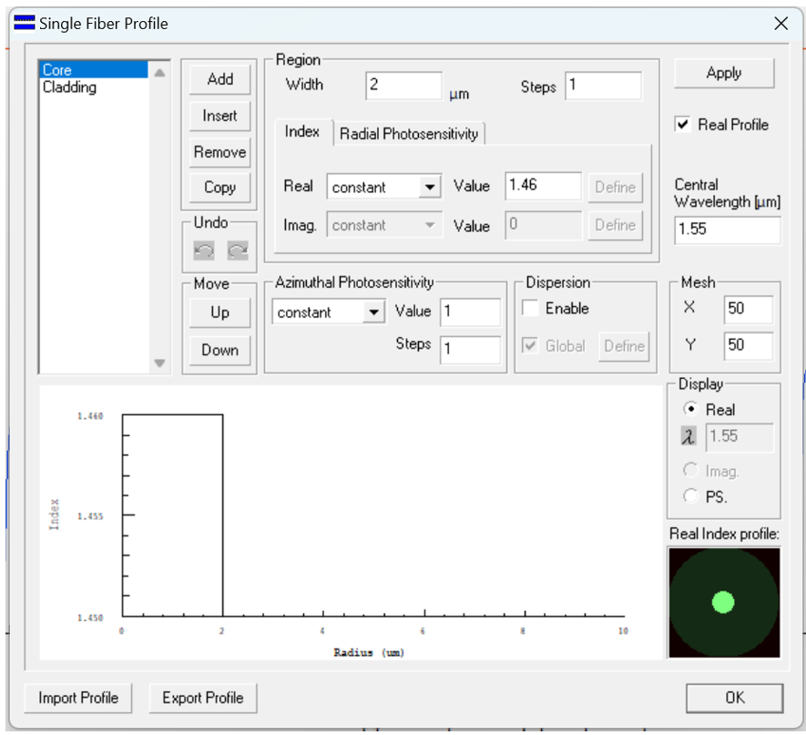 為了補(bǔ)償累積色散,我們將使用OptiGrating設(shè)計(jì)線性啁啾光纖光柵。光纖和光柵的相應(yīng)數(shù)據(jù)如圖4和圖5所示。