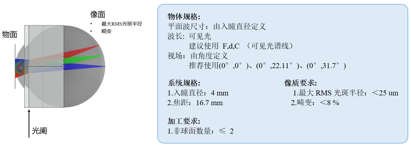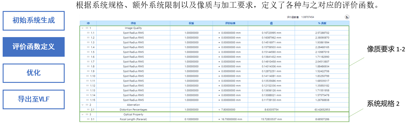 根據(jù)系統(tǒng)規(guī)格、額外系統(tǒng)限制以及像質(zhì)與加工要求,定義了各種與之對應(yīng)的評價函數(shù)。