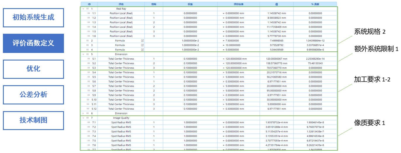 根據(jù)系統(tǒng)規(guī)格、額外系統(tǒng)限制以及像質(zhì)與加工要求,定義了各種與之對(duì)應(yīng)的評(píng)價(jià)函數(shù)。