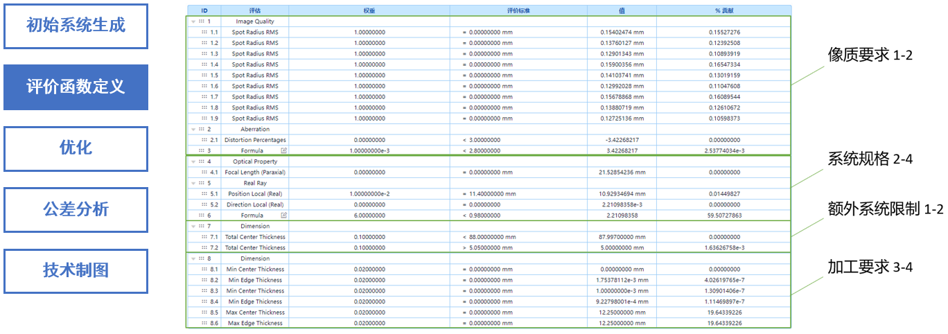 根據(jù)系統(tǒng)規(guī)格、額外系統(tǒng)限制以及像質(zhì)與加工要求,定義了各種與之對(duì)應(yīng)的評(píng)價(jià)函數(shù)。