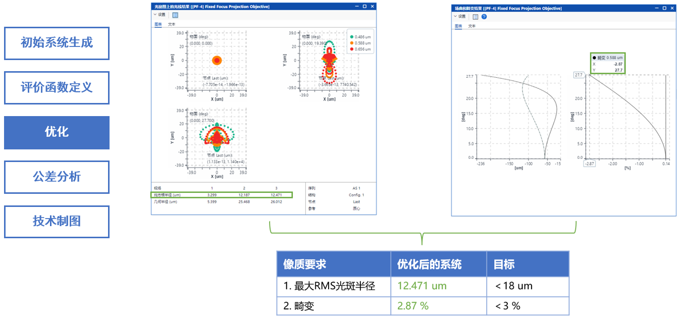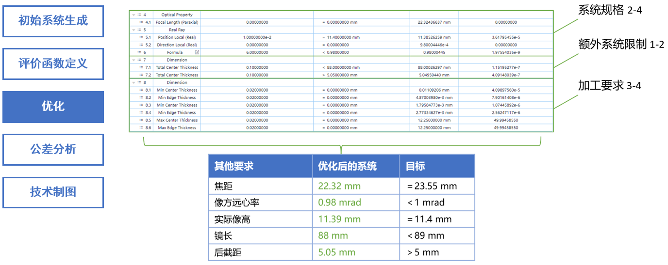 通過采用PSD算法進(jìn)行優(yōu)化后,滿足了像質(zhì)要求 1-2、系統(tǒng)規(guī)格 2-4、額外系統(tǒng)限制1-2以及加工要求 3-4。