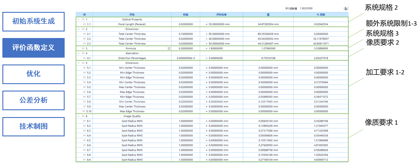 根據(jù)系統(tǒng)規(guī)格、額外系統(tǒng)限制以及像質(zhì)與加工要求,定義了各種與之對應(yīng)的評價函數(shù)。