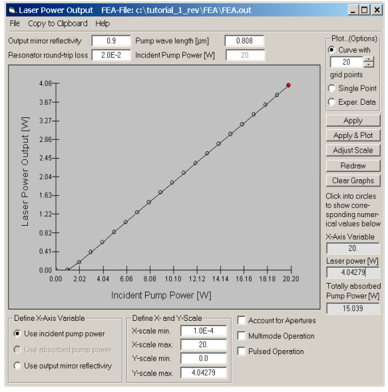 作為入射泵浦功率的一個(gè)函數(shù),輸出激光功率可以通過(guò)按下“Plot”按鈕開始計(jì)算。按下“Adjust Range”按鈕可以調(diào)整繪出曲線和坐標(biāo)軸限制相適應(yīng)。為了計(jì)算此圖,對(duì)熱透鏡效應(yīng)作了線性調(diào)整,第3節(jié)的“Modifying cavity parameters”有對(duì)這個(gè)問(wèn)題的相關(guān)描述。計(jì)算的點(diǎn)數(shù)可以通過(guò)窗口右上角的上下箭頭來(lái)改變。