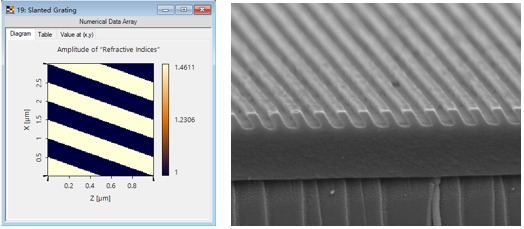 左圖:基于VirtualLab Fusion設(shè)計的傾斜光柵折射率分布;右圖:加工所得的傾斜光柵