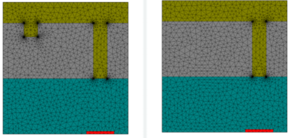 狹縫槽設置(左)和用于歸一化的狹縫設置(右)的三角形網格;灰色:銀膜,藍色:基板,紅色:檢測器區(qū)域,綠色:空氣;請注意金屬角處網格的預細化。