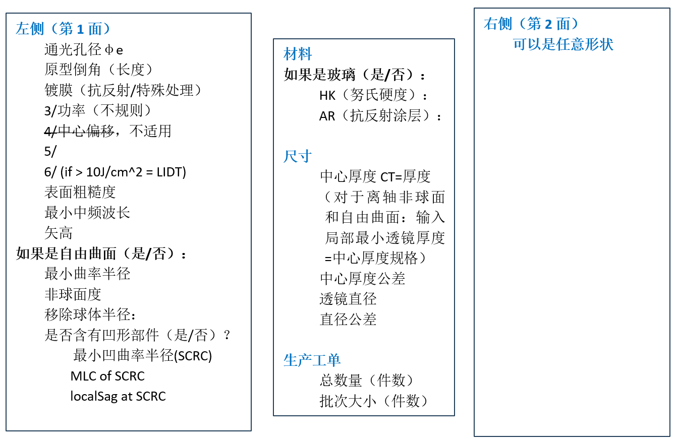 對于自由曲面光學(xué)系統(tǒng)的4/定心精度,軟件當(dāng)前沒有指定4/定心精度,需要在鏡片的另一側(cè)輸入4/定心精度。目前,也沒有為自由曲面生成中心研磨成本。