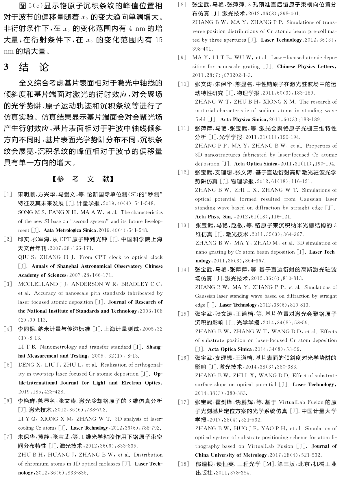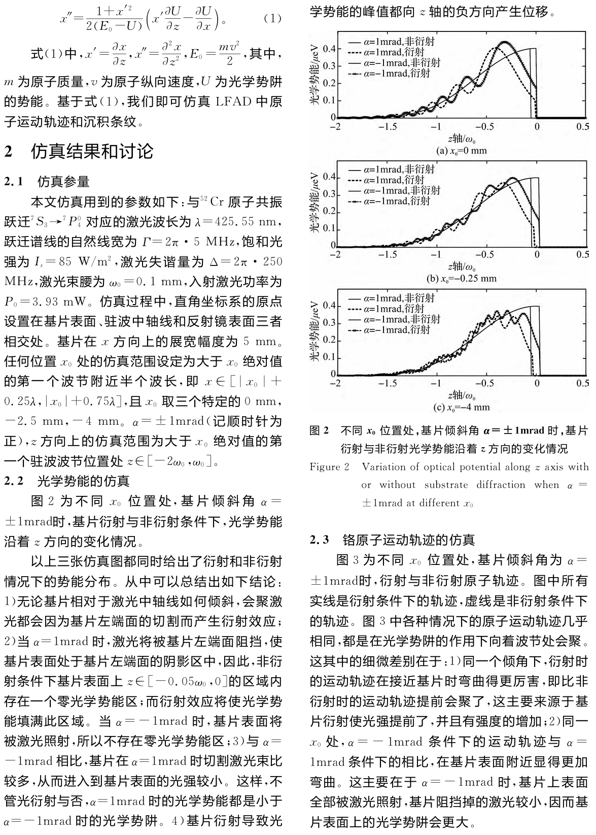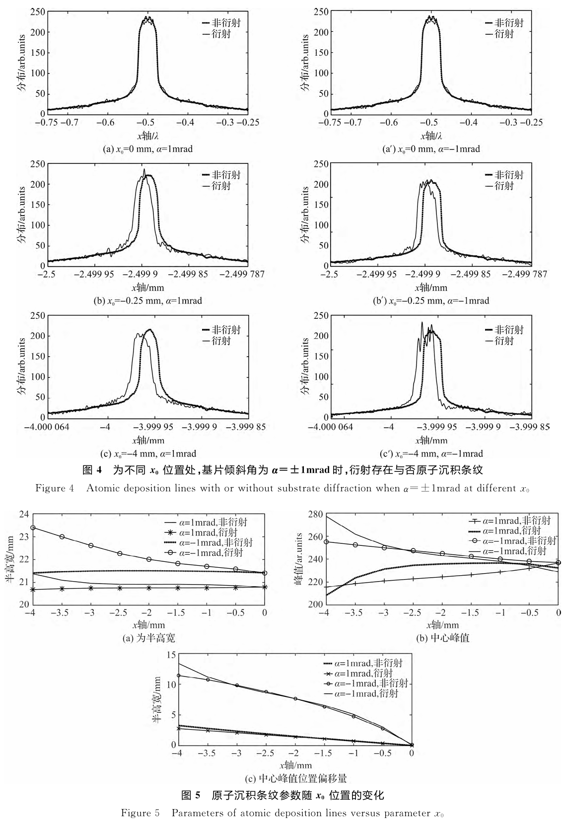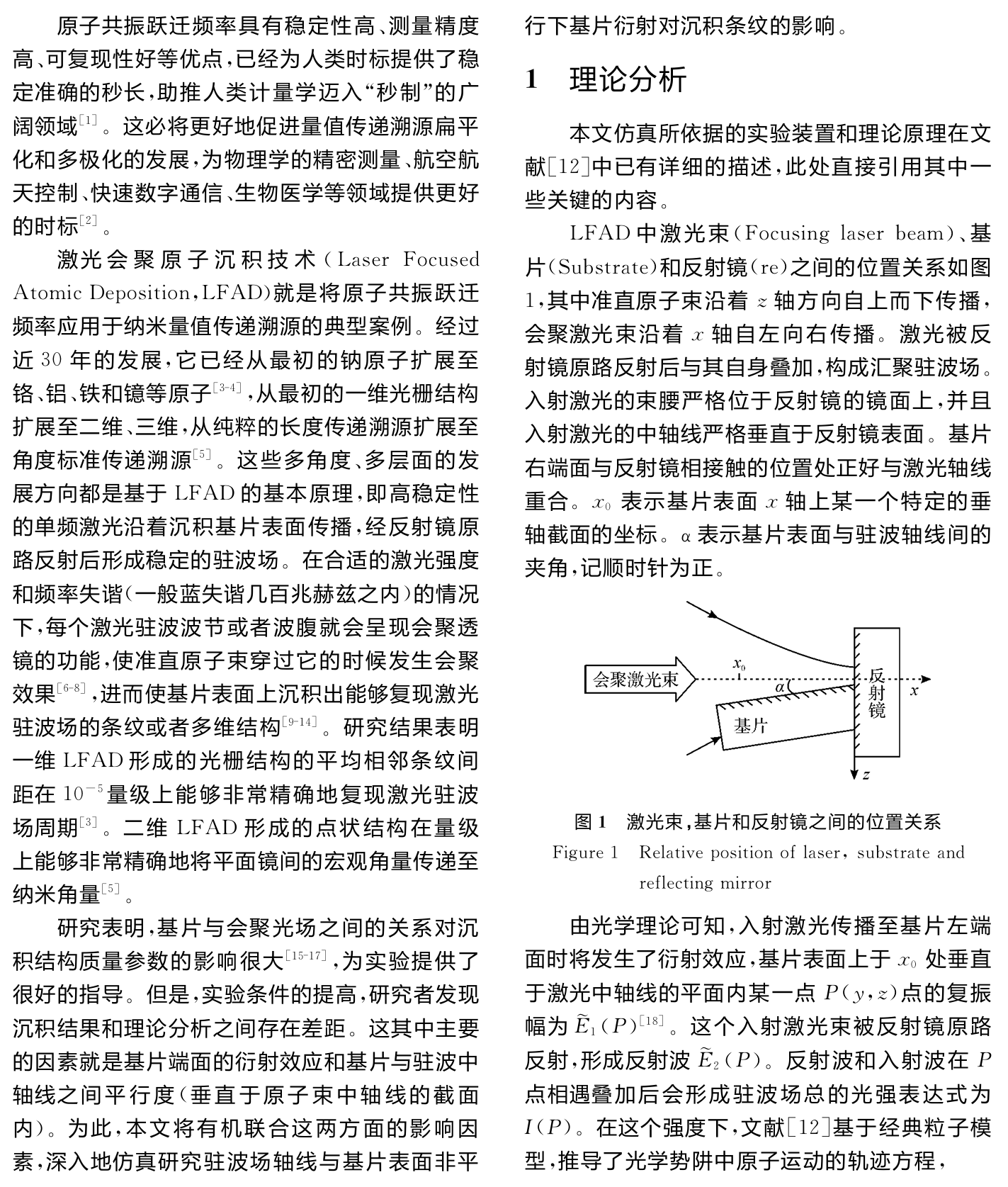 目的:探究基片對激光會聚原子沉積的影響。方法:根據(jù)光學(xué)勢阱中原子運動的軌跡方程,對會聚場的光學(xué)勢阱、原子運動軌跡和沉積條紋等進(jìn)行了仿真實驗。結(jié)果:衍射式光學(xué)勢阱使原子軌跡提前會聚,進(jìn)而與傾斜角一起對沉積條紋的質(zhì)量參數(shù)產(chǎn)生了影響。在正傾時,隨著的增大,條紋半高寬增大,條紋峰值減;在負(fù)傾斜時,隨著的增大,條紋半高寬保持不變,條紋峰值增大;同時隨著的增大,沉積條紋的峰值位置相對于波節(jié)的偏移量趨向單調(diào)增大。在非衍射條件下,偏移量增大4nm;在衍射條件下,偏移量增大15nm。結(jié)論:由于衍射的存在,不管基片表面正傾斜還是負(fù)傾斜,基片表面上方沿著z方向都會存在一個直邊衍射式的光學(xué)勢阱。