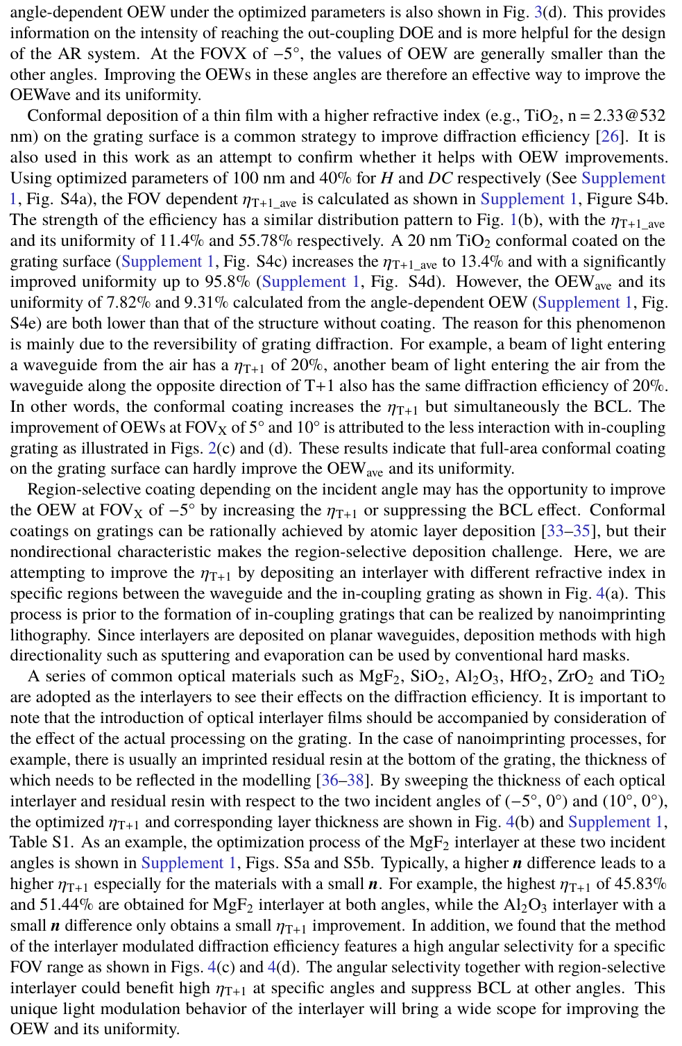 摘要:整體效率和圖像均勻性是增強現(xiàn)實顯示的重要評判標準。傳統(tǒng)的入射耦合光柵設(shè)計僅致力于提高一階衍射效率,卻未考慮光波導中衍射光的多次相互作用,因此存在不足。本研究中,為優(yōu)化耦合光柵設(shè)計,引入了入射耦合表面浮雕光柵的背耦合損耗(BCL),以及到達出射耦合光柵的光功率與入射光功率的比值(定義為波導光效率,OEW)。通過在波導與光柵之間插入中間層,我們展示了一種兼具獨特角度選擇性與高衍射效率的簡單有效的方案。引入?yún)^(qū)域選擇性氟化鎂(MgF₂)中間層后,在 40° 視場角下,優(yōu)化后的平均波導光效率從 8.02% 提升至 8.34%,其均勻性從 24.83% 提升至 35.02%。