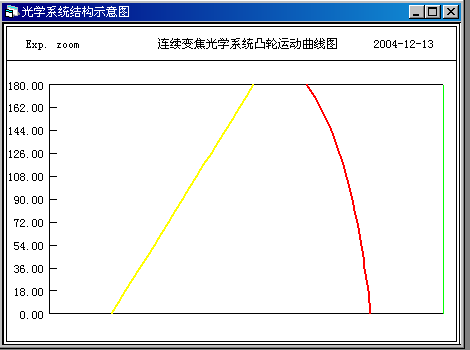 在顯示可變焦距光學(xué)系統(tǒng)示意圖的同時(shí),還可自動(dòng)計(jì)算并顯示連續(xù)變焦光學(xué)系統(tǒng)凸輪曲線。對(duì)三組元連續(xù)變焦系統(tǒng),還可根據(jù)需要計(jì)算任意點(diǎn)數(shù)的凸輪曲線以及曲線的坐標(biāo)值等。對(duì)非三組元連續(xù)變焦系統(tǒng),還可根據(jù)系統(tǒng)給出的可變間隔數(shù)據(jù)計(jì)算指定點(diǎn)數(shù)的凸輪曲線以及曲線的坐標(biāo)值。
